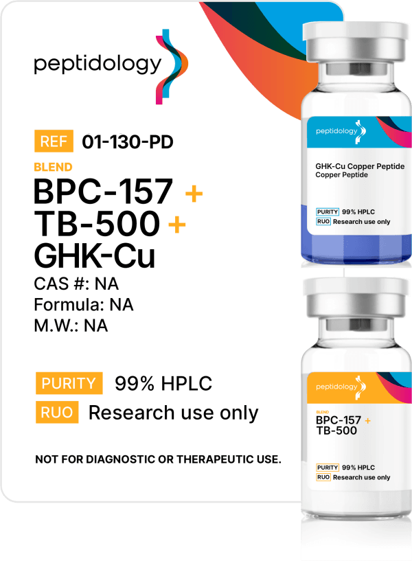 This product includes two vials total — one vial containing 10mg of BPC-157 and TB-500 and a vial of GHK-Cu 100mg.