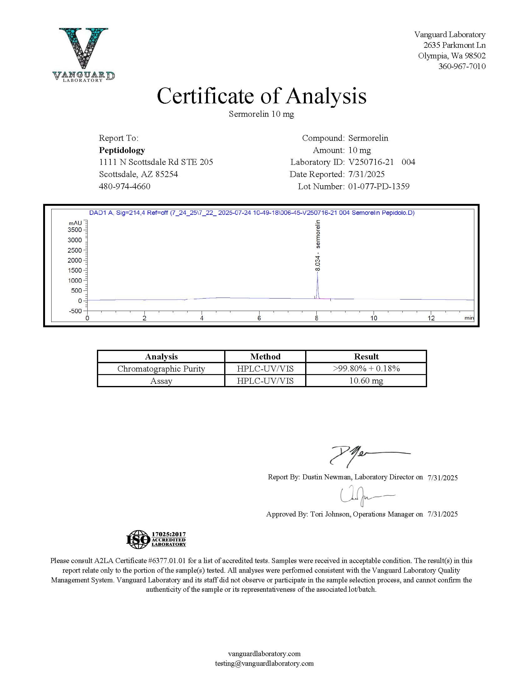 Batch 1359 – Sermorelin 99.8% 10.60 mg
