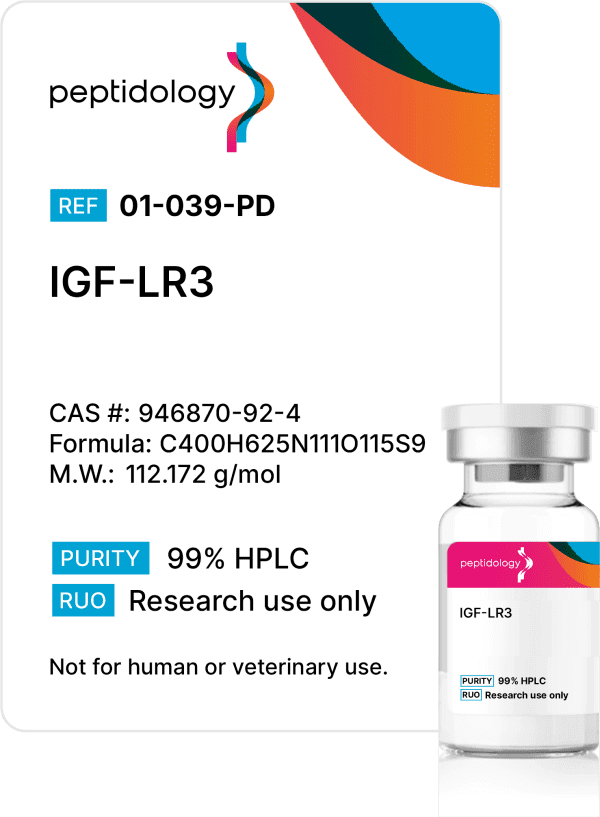 IGF-1 LR3 is a 83-amino-acid analog of insulin-like growth factor 1 engineered by (1) extending the native 70-residue sequence with a 13-residue N-terminal peptide and (2) replacing the third amino acid with arginine. These changes reduce its affinity for IGF-binding proteins and protect it from rapid enzymatic cleavage, prolonging plasma half-life from ~10 min to 6–10 h. Freed from most carrier constraints, IGF-1 LR3 more readily engages IGF-1 receptors (and, to a lesser extent, insulin receptors), triggering the canonical PI3K-Akt-mTOR and MAPK/ERK pathways that drive glucose uptake, protein synthesis, mitosis, and tissue remodeling.